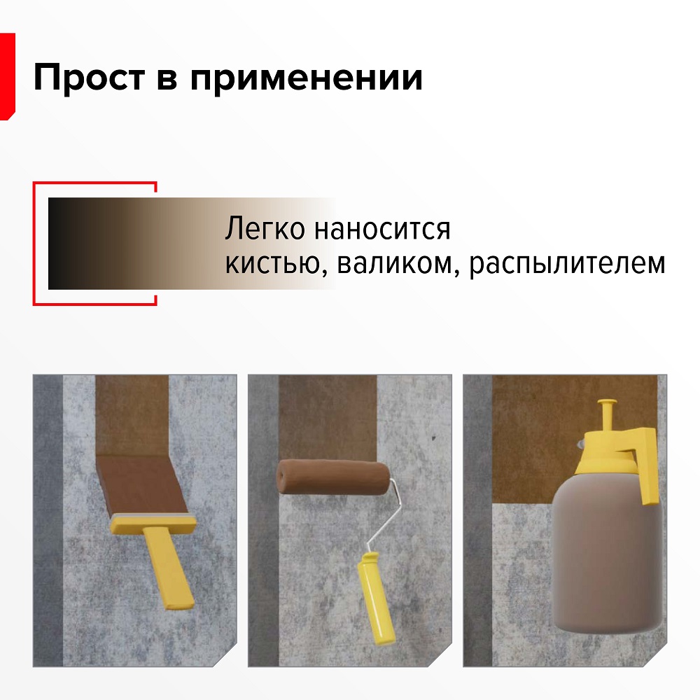 После высыхания праймер становится чёрным, что позволяет легко определить готовность поверхности к нанесению гидроизоляционных материалов. Можно использовать при температуре от 0°С до +40°С. Он наносится за один раз, что позволяет экономить время и материалы.